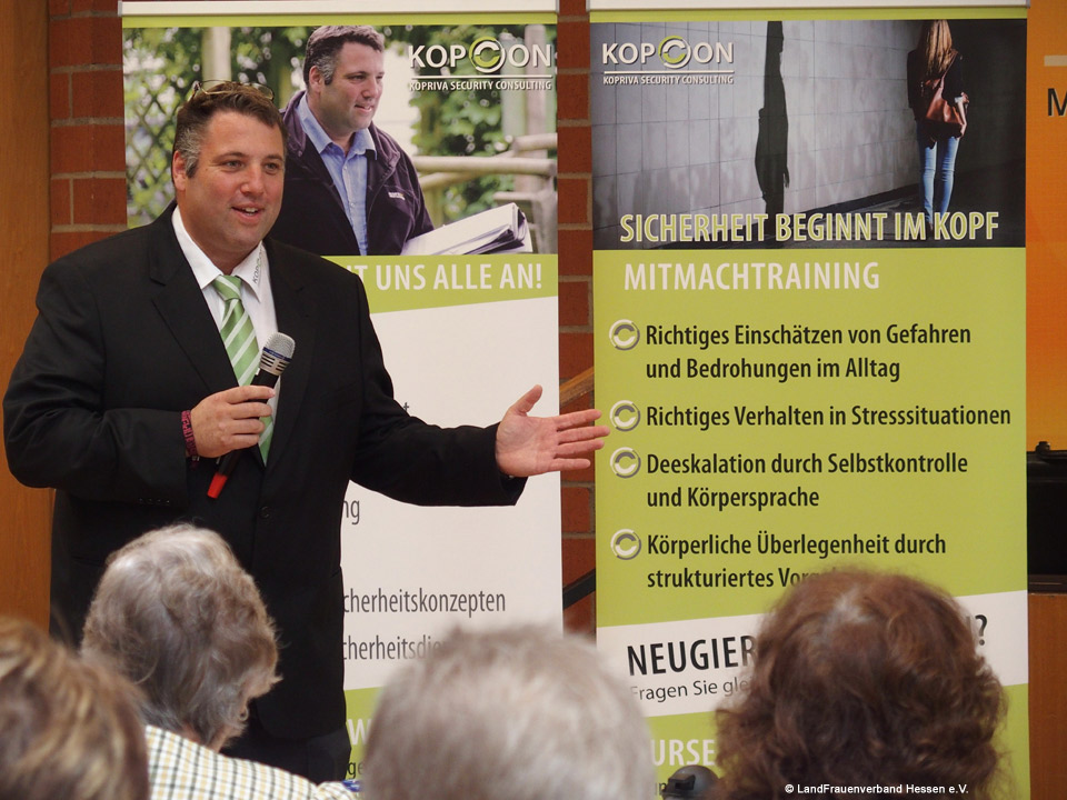 Ein selbstbewusstes Auftreten und das Erkennen von Gefahren und Bedrohungen im Alltag sind von großer Bedeutung. Oliver Kopriva, von Kopcon; Security Consulting GbR, bietet entsprechende Sicherheitskurse für Frauen, Kinder und weitere Zielgruppen an und stellte diese vor. „Wir vermitteln Achtsamkeit und Handlungssicherheit in unseren aktiven Mitmachtrainings. Sie lernen das richtige Verhalten in Stresssituationen und wie sie durch Selbstkontrolle und Körpersprache deeskalieren können“, erklärte Oliver Kopriva.